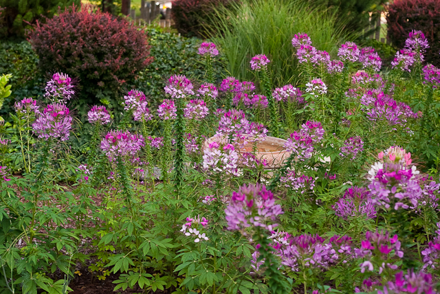 The magic is two part. One, grow it in a contained area. Mine is only “sort of” contained. The path on the right does let a few cleome grow, and some do try to sneak in on the left. Two, I need to be diligent in snagging the young seedlings when I walk past. Note I said diligent, and I mean it. No digging, just pull the babies out. They are really easy to recognize, and for the beautiful border I get, I am willing.