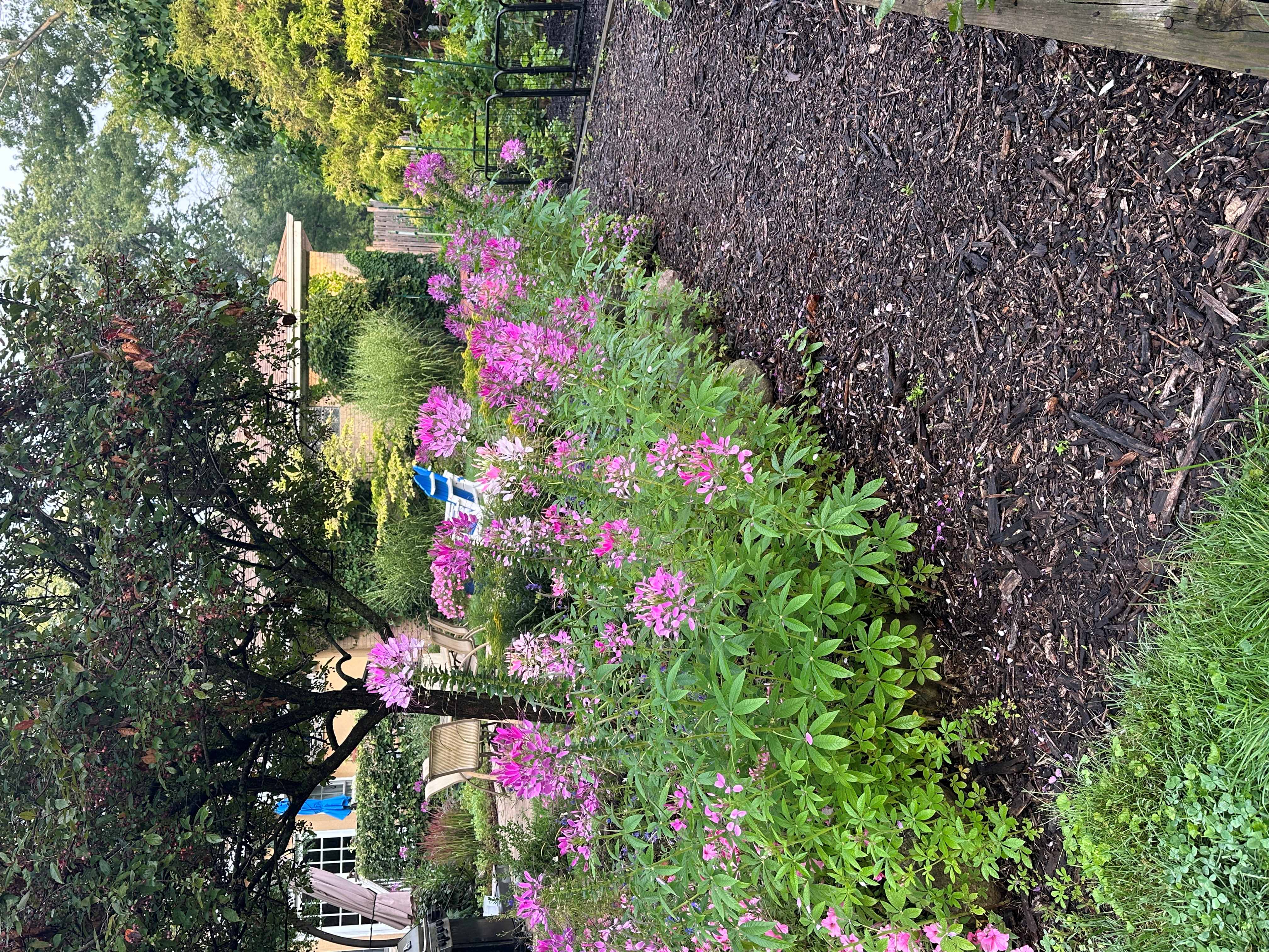 It was totally cool. It is also something that we have NEVER let happen again. Here we have this year’s photo. Still a lot of cleome, but a lovely border to the path.