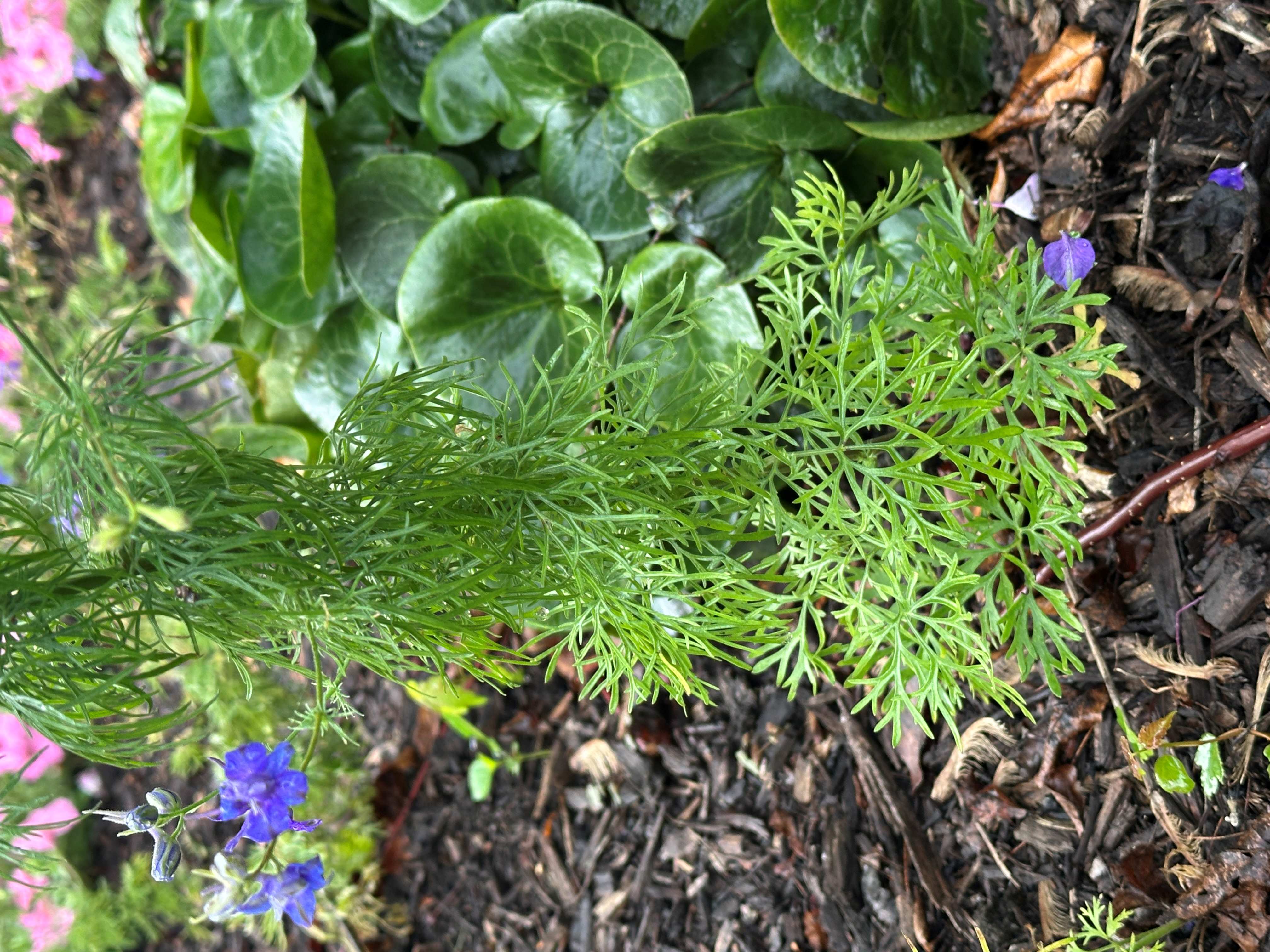 I also let larkspur live. As long as it pops up where I want it. Again, a controlled area, this time with grass on one side and a path on the other, and a recognizable seedling to pull, Its a “memory plant” for me. You know, the kind of plant that comes with memories. The seeds came from Betty, my vice-president at the Elk Grove Garden Club many years ago. Seeing the larkspur reminds me of Betty, who has long since retired to Florida.