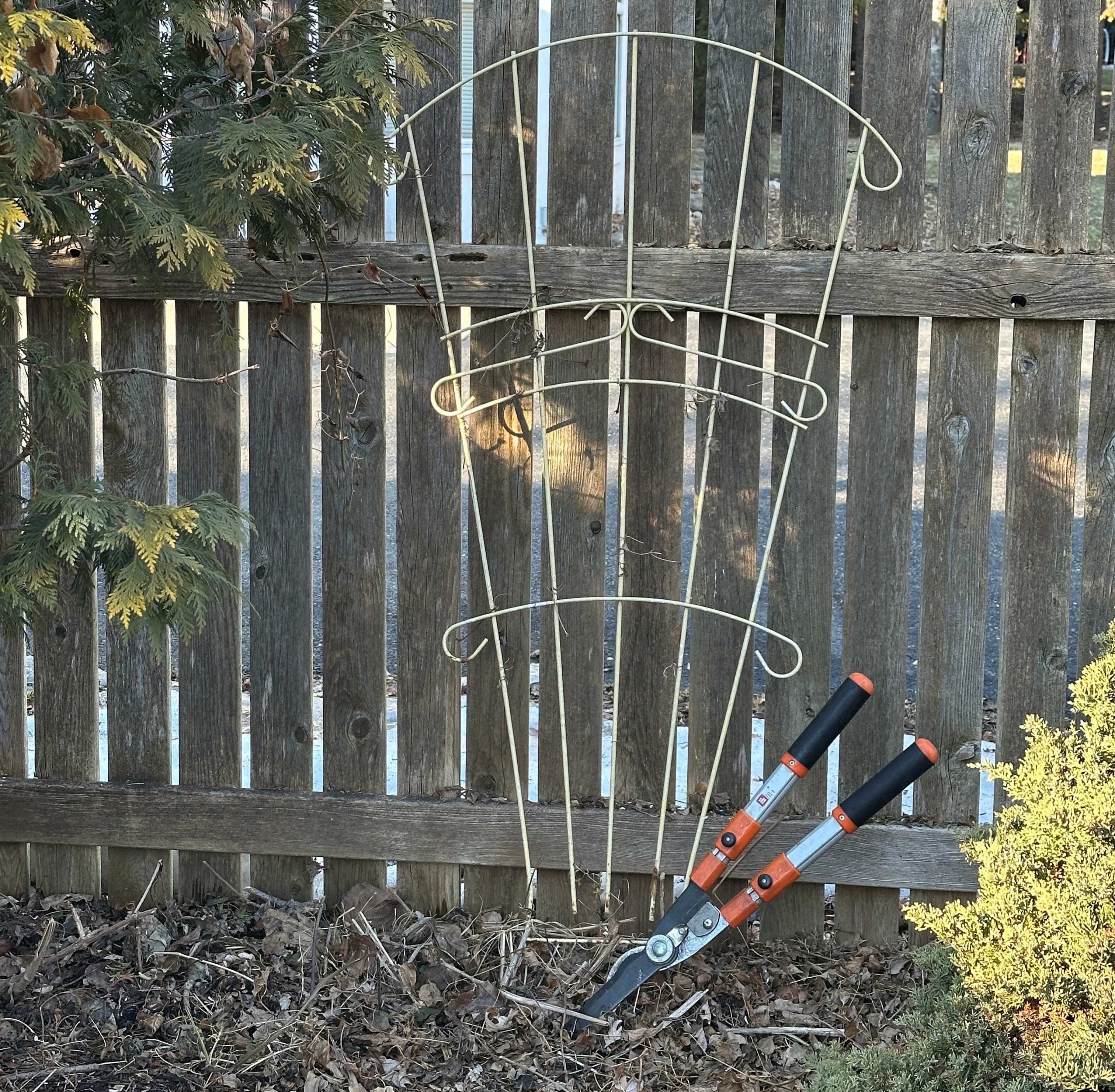 We reuse it every year, and every few years the paint needs a touch up. One other great thing about it is that we can rearrange the horizontal rebar as needed. See, they just stick through the decorative scrolls and we can move them up as the plants grow.